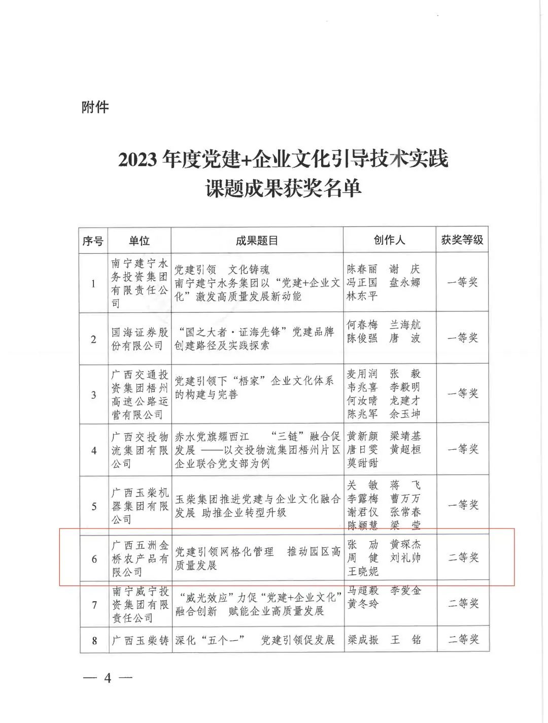 近日,由太阳集团城网址9728推选的《党建引领网格化管理推动园区高质量发展》等5项党建+企业文化引导技术实践课题获广西企业文化建设协会通报表彰;坛百公司《传红色基因 铸红色堡垒——“红路党建 五洲驿站”》入选中国文化管理协会“以高质量党建引领企业高质量发展创新优秀成果”,并正式编入由人民日报出版社出版发行的《奋进新征程 再创新辉煌——党建引领企业高质量发展创新成果汇编》。