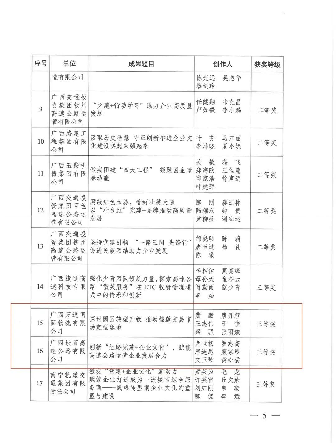坛百公司《创新“红路党建+企业文化”,赋能高速公路运营企业发展合力》获三等奖(作者:龙世扬、罗志高、唐连恩、颜家琴、文玉琴、黄心橘)。