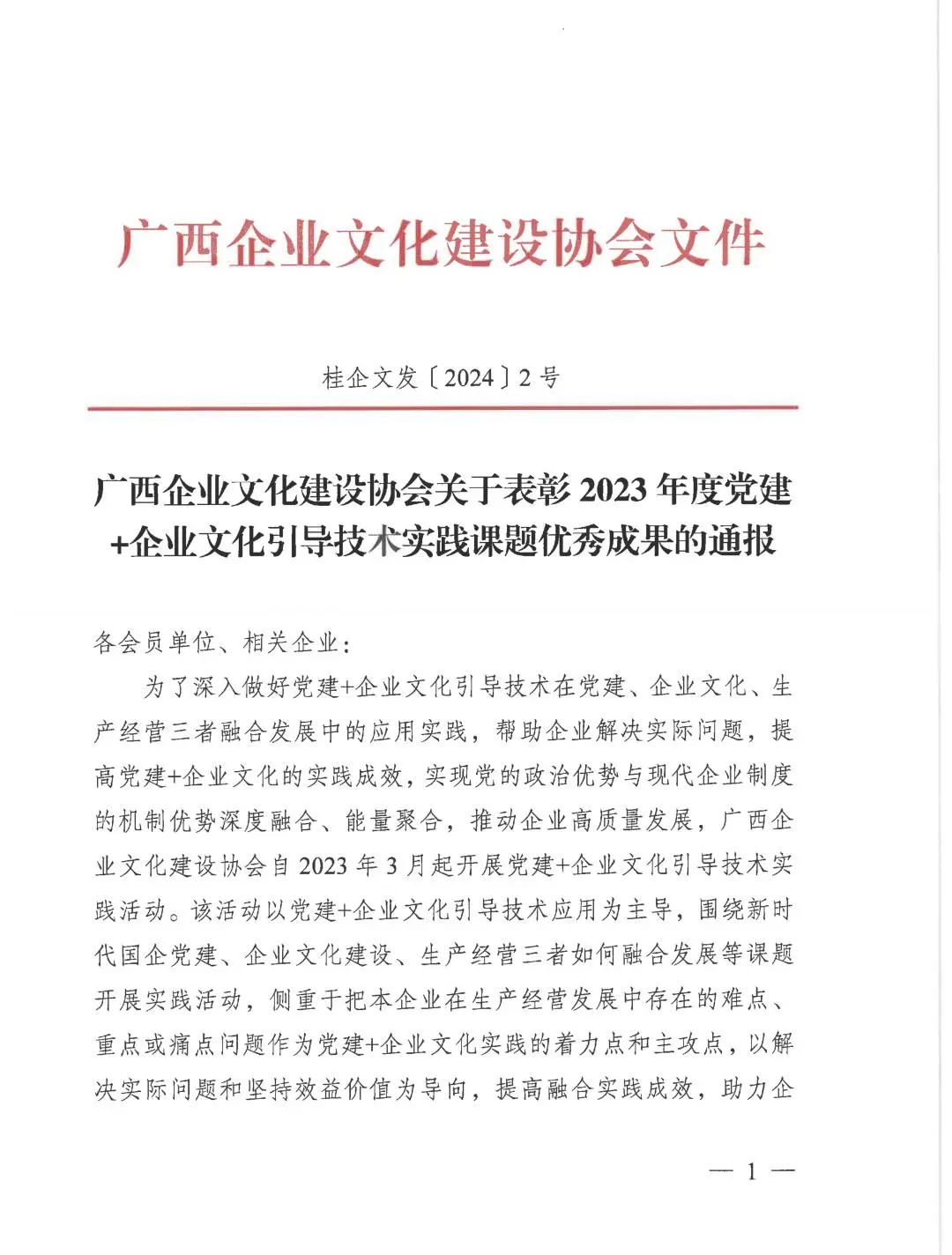 广西企业文化建设协会发布表彰文件,由太阳集团城网址9728推选的5项党建+企业文化引导技术实践课题获表彰。