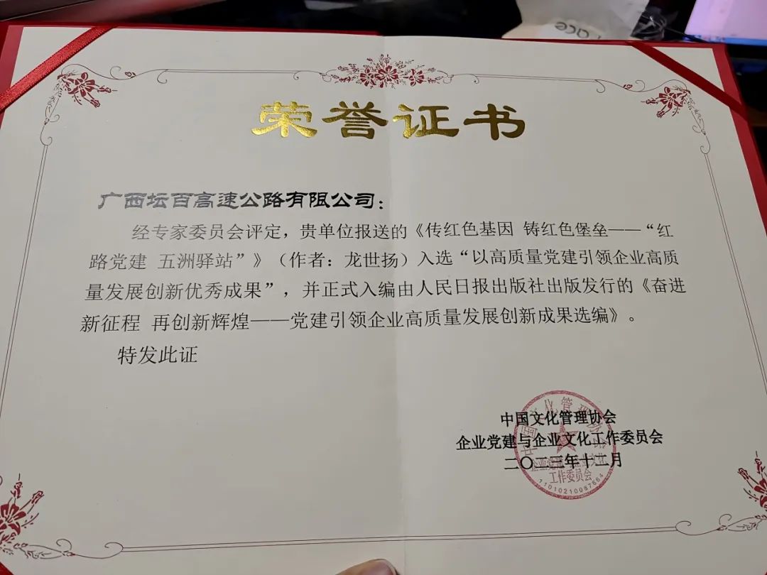 坛百公司《传红色基因 铸红色堡垒——“红路党建 五洲驿站”》(作者:龙世扬)入选中国文化管理协会“以高质量党建引领企业高质量发展创新优秀成果”,并正式编入由人民日报出版社出版发行的《奋进新征程 再创新辉煌——党建引领企业高质量发展创新成果汇编》。