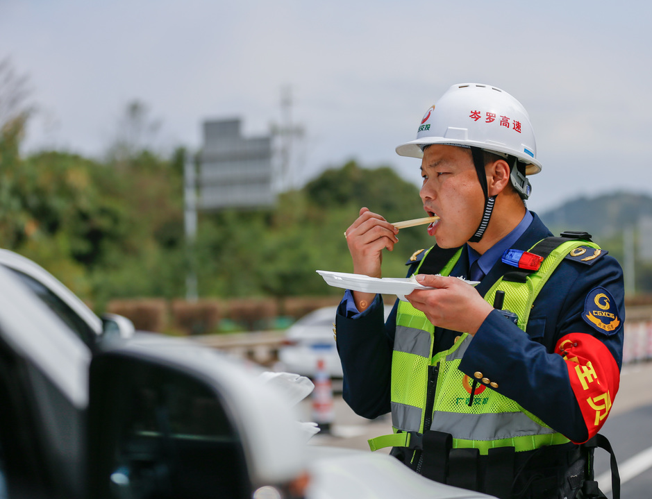 一阵忙碌后,车流开始有序分流。但这也让冯林和同事错过了吃饭的时间,好在后勤保障组专门打包了盒饭给他们送了过来。