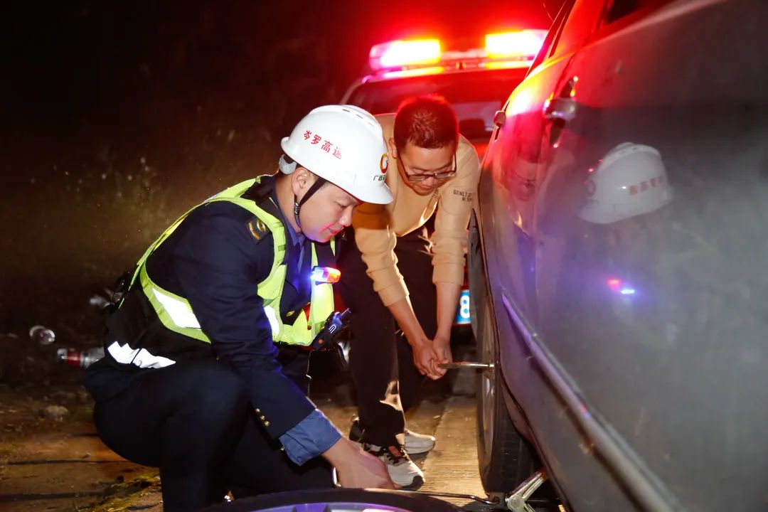 夜阑人静,庞大的车流渐渐减少,应急指挥中心解除了车流峰值预警,忙碌了一整天的冯林终于松了口气,开始踏上归途。突然,他发现一辆车打着双闪灯停靠在应急车道内,司乘人员正手忙脚乱地摆弄着轮胎。确认安全后,冯林立即靠边停车,并上前询问,原来该车轮胎气压过低,正准备更换备胎,但由于司机经验不足,摆弄了很久依然没有头绪。了解情况后,冯林二话不说,立即摆好警示牌,熟练地从后备箱中取出千斤顶,从司机手中接过扳手,很快便更换好备胎,同时叮嘱司机就近下高速进行维修,司机连声道谢后继续向前行驶。看着车辆平稳驶去,冯林也再次踏上了归途,车上的两束光就像屹立的灯塔,为司乘照亮回家的路。