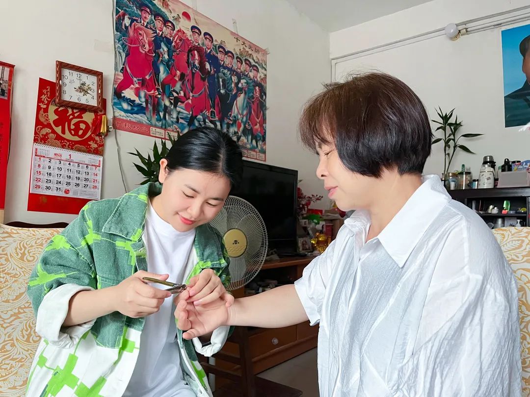 原来,春节期间一直值班的火凤,难得今天下班后没有安排,于是她匆匆赶回家里陪陪家人。今天看到妈妈指甲长了,她贴心找来指甲剪,细心地帮妈妈修理指甲。